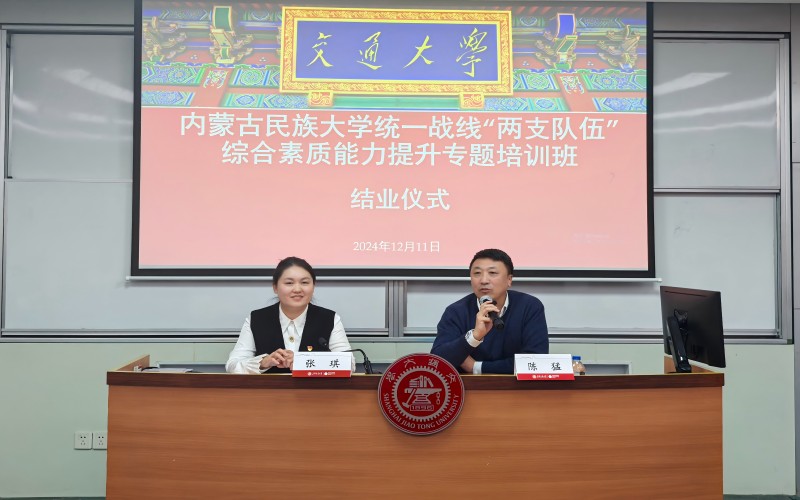 12月11日下午,我校统一战线“两支队伍”综合素质能力提升专题培训班在上海交通大学圆满结业。上海交通大学终身教育学院副院长陈猛,终身教育学院高教管理能力提升创新中心主任叶艳;我校党委委员、统战部部长张琪,副部长李生出席结业仪式。学校各分党委统战委员,民主党派、无党派人士代表共36名学员参加结业仪式。上海交通大学终身教育学院高教管理能力提升创新中心项目主管程芬主持结业仪式。