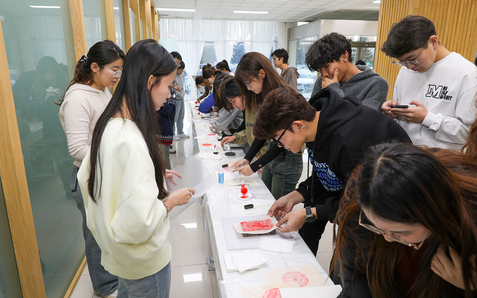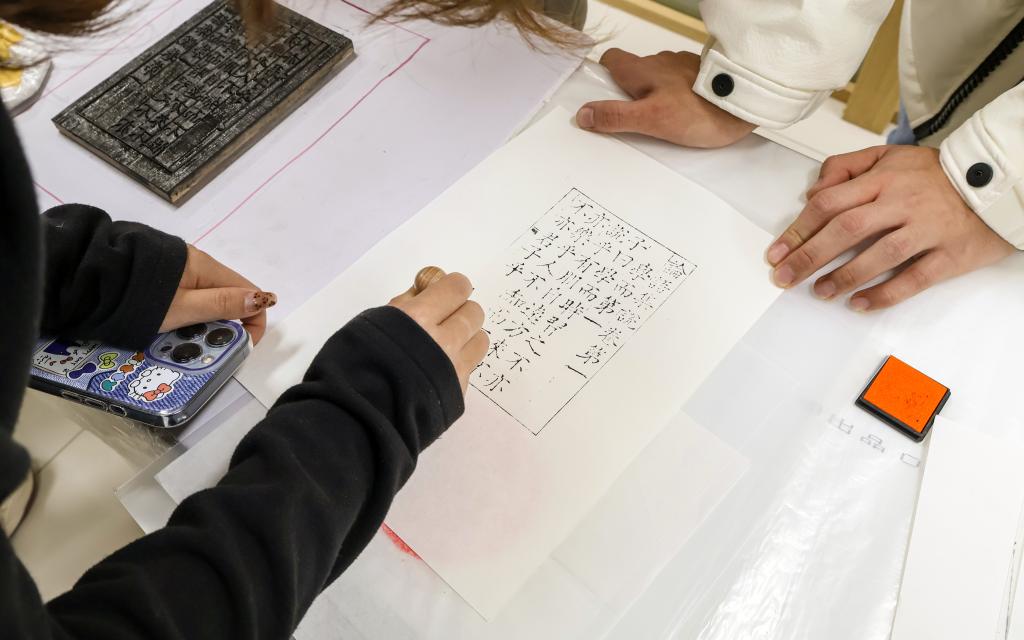 展览现场,图书馆为学生提供了传统雕版印刷、拓印等非遗项目体验,同学们在馆员指导下制作完成作品,通过沉浸式体验非遗技艺,提升了学生对非遗文化知识的了解,增强了对非遗文化的传承和保护意识。
