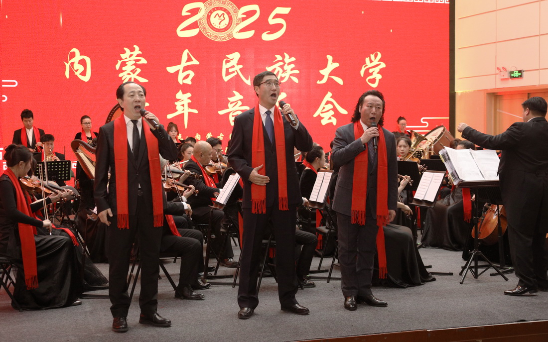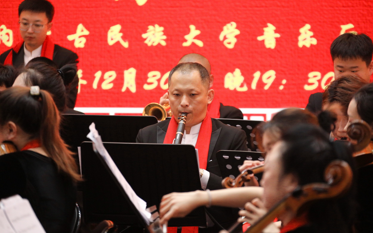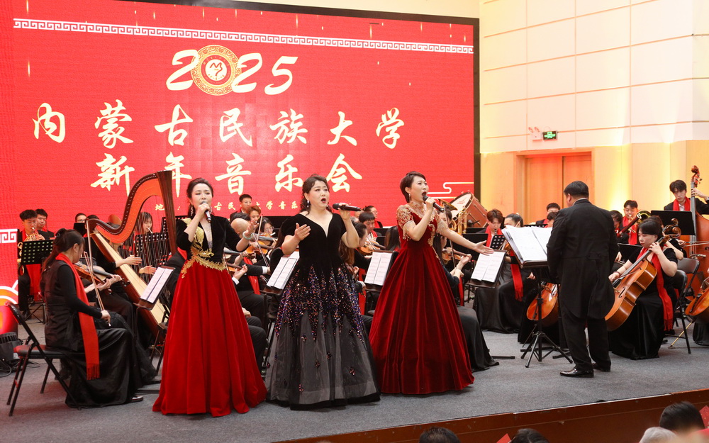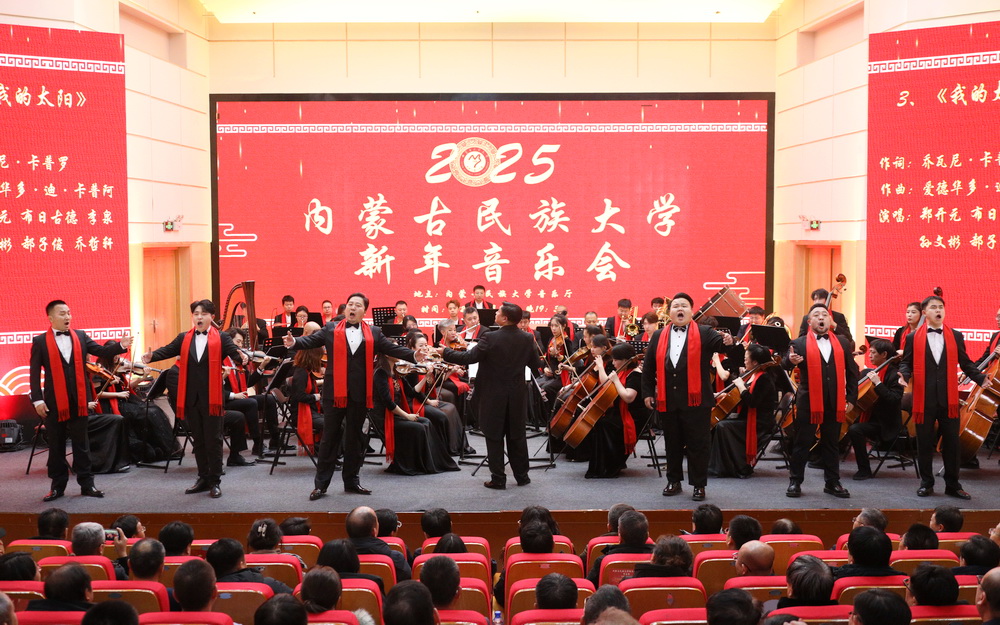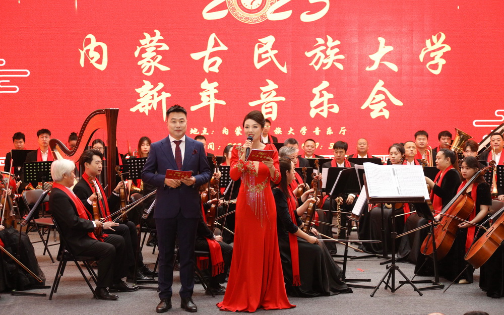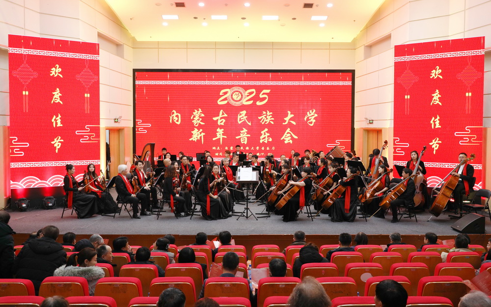 12月30日晚,内蒙古民族大学2025年新年音乐会在西拉木伦校区逸夫楼音乐厅隆重举行。校党委书记赵东海,校党委副书记、校长孟祥宏,校党委委员、副校长杨恒山,校党委委员、副校长陈英松,校党委委员、副校长裴志利,校党委委员、纪委书记、监察专员国庆,校党委委员、副校长王百涛,副校长红梅,校党委委员、宣传部部长孙林,校党委委员、统战部部长张琪出席音乐会。全校副处级以上干部、离退休人员代表,辛苦工作在服务管理一线岗位的公寓管理服务人员代表、安保人员代表、派出所民警代表、后勤服务保障人员代表、附属医院医护人员代表以及师生代表400余人齐聚一堂,共同聆听音乐盛宴。