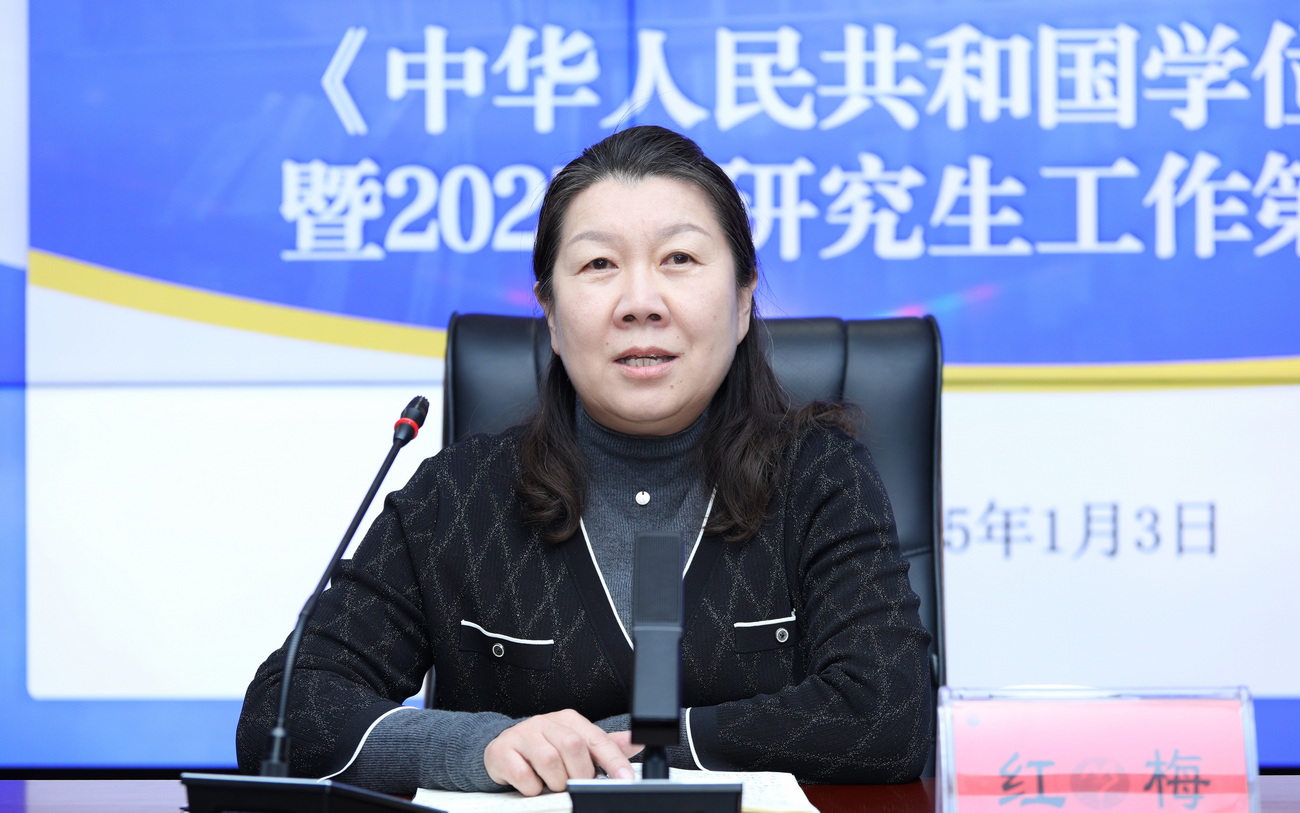 红梅在讲话中肯定了我校2024年学科建设与研究生教育工作取得的成绩,并从学科晋位升级、学科经费使用、学位点申报、研究生项目申报、研究生培养基地建设、研究生自命题评卷、研究生学位论文盲审、研究生培养计划制定等八个方面,对学校2025年研究生教育工作提出了明确要求。