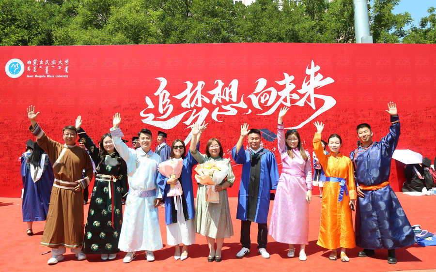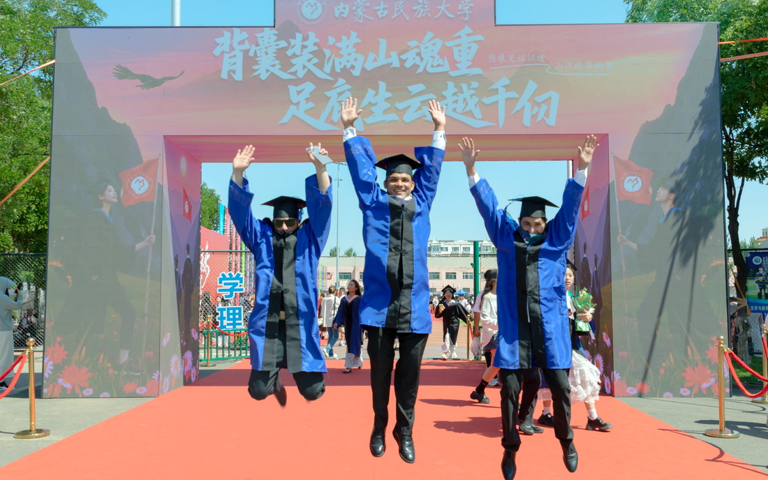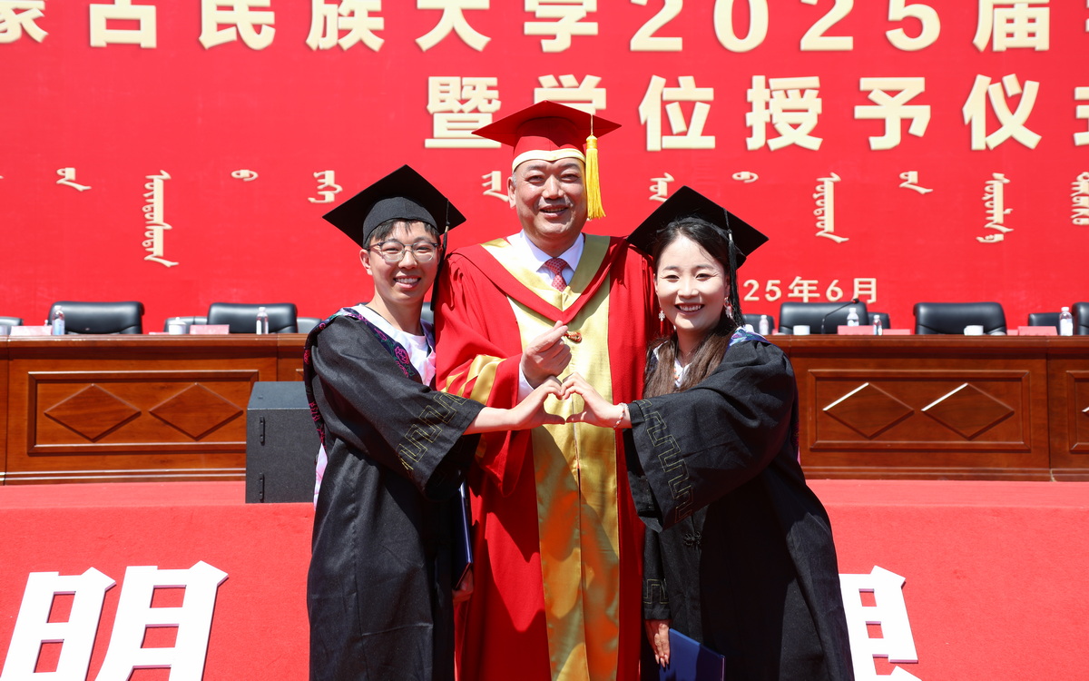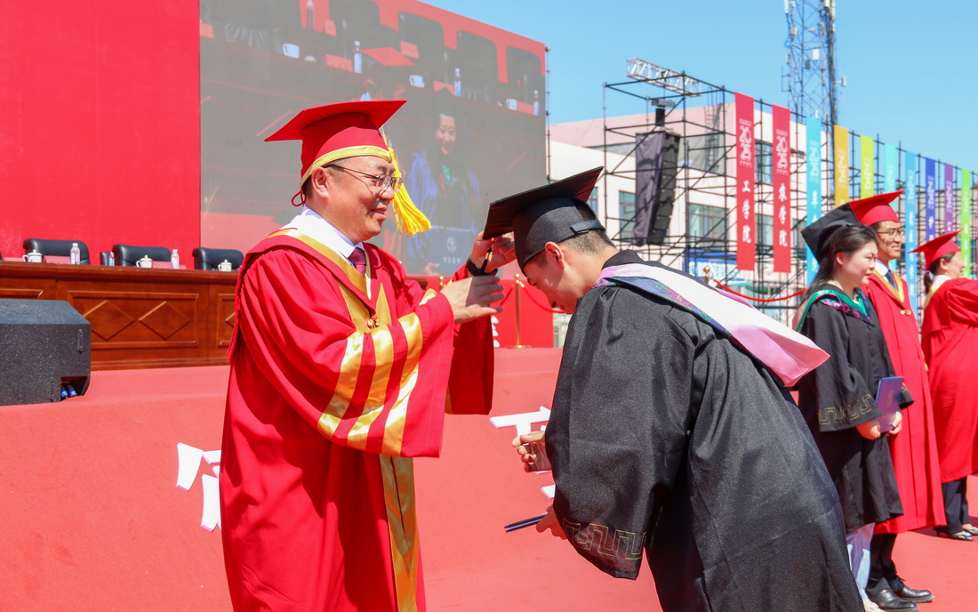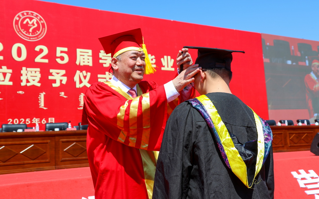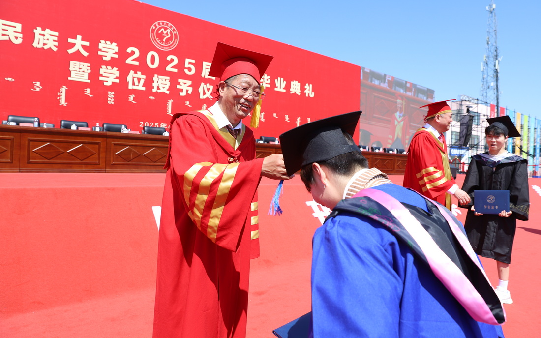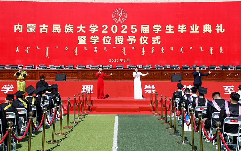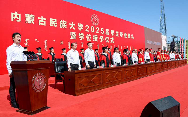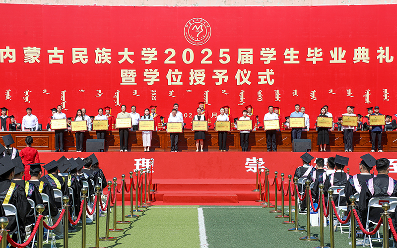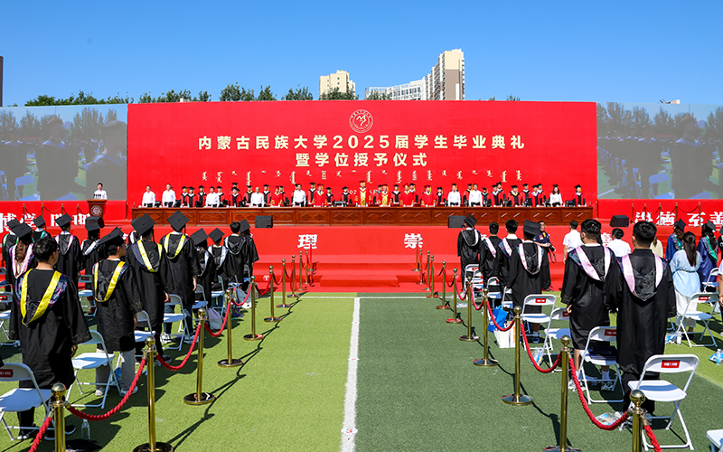 仲夏时节,桃李芬芳。6月23日上午,内蒙古民族大学2025届学生毕业典礼暨学位授予仪式在霍林河校区体育场隆重举行。校党委书记、校学位评定委员会副主席赵东海教授,校党委副书记、校长、校学位评定委员会主席孟祥宏教授,校党委副书记王烨辉,校党委委员、副校长、校学位评定委员会副主席杨恒山教授、陈英松教授、裴志利教授,校党委委员、副校长王百涛,校党委委员、纪委书记包灵,副校长、校学位评定委员会副主席红梅教授,校党委委员、宣传部部长孙林,校党委委员、组织部部长付向阳教授,校党委委员、统战部部长张琪教授,以及校学位评定委员会全体委员出席典礼。2025届毕业生,全校副处级以上干部,各学院学工系统人员、毕业班班主任,教师代表、校友代表、家长代表等参加典礼。王烨辉主持典礼。