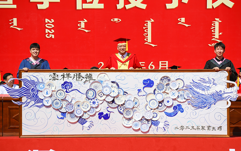 赵东海代表学校接受2025届毕业生代表赠送的毕业纪念品。纪念品是由美术与设计学院等26个学院的100名毕业生历时数日,用青花瓷纸盘精心绘制的“龙腾祥云”图案,寓意母校事业发展蒸蒸日上,表达了全体毕业生对母校深切的感激之意和浓浓的祝福之情!