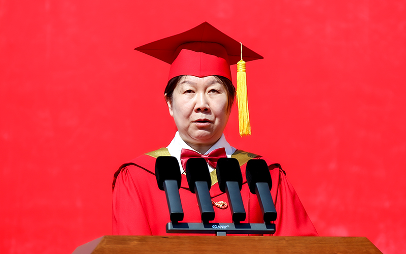 副校长、校学位评定委员会副主席红梅教授为毕业生扶正流苏
