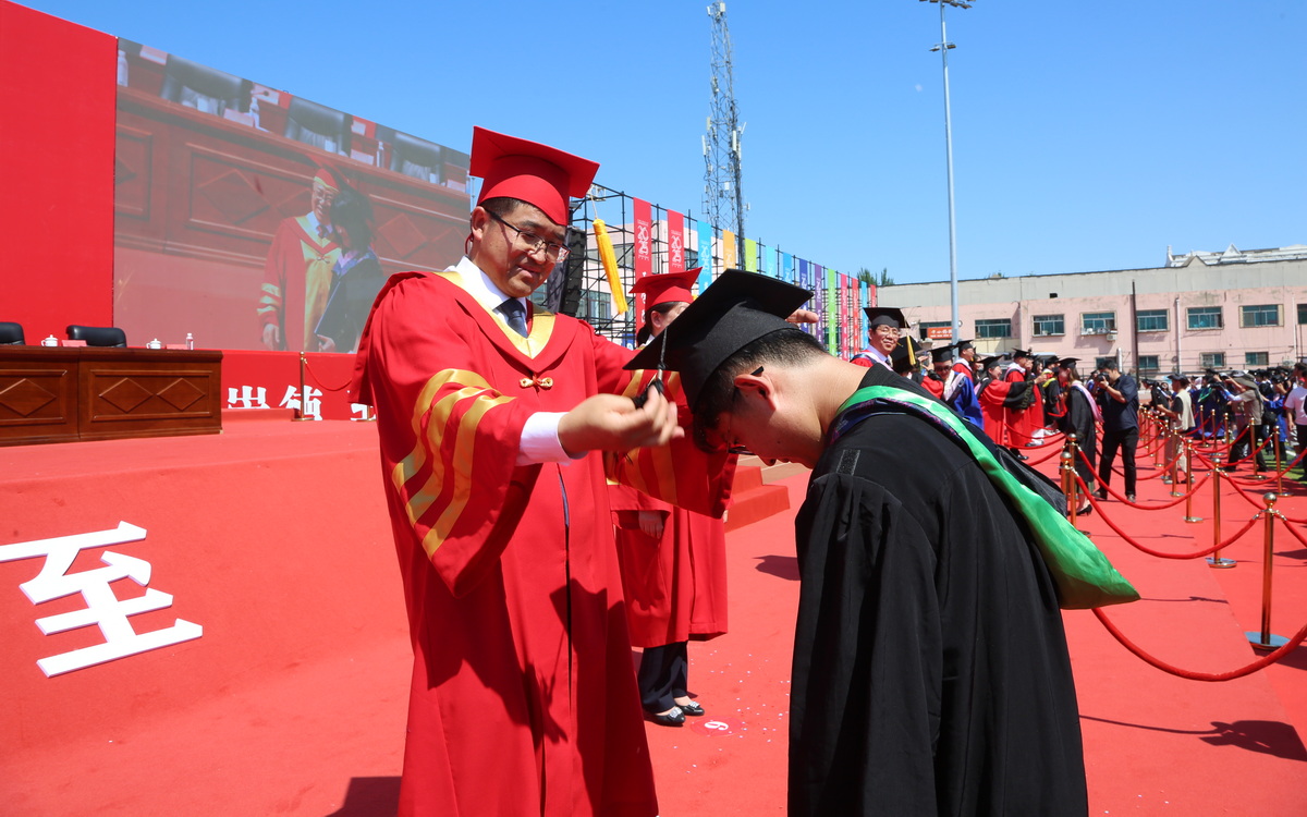 校党委委员、副校长、校学位评定委员会副主席裴志利教授为毕业生扶正流苏