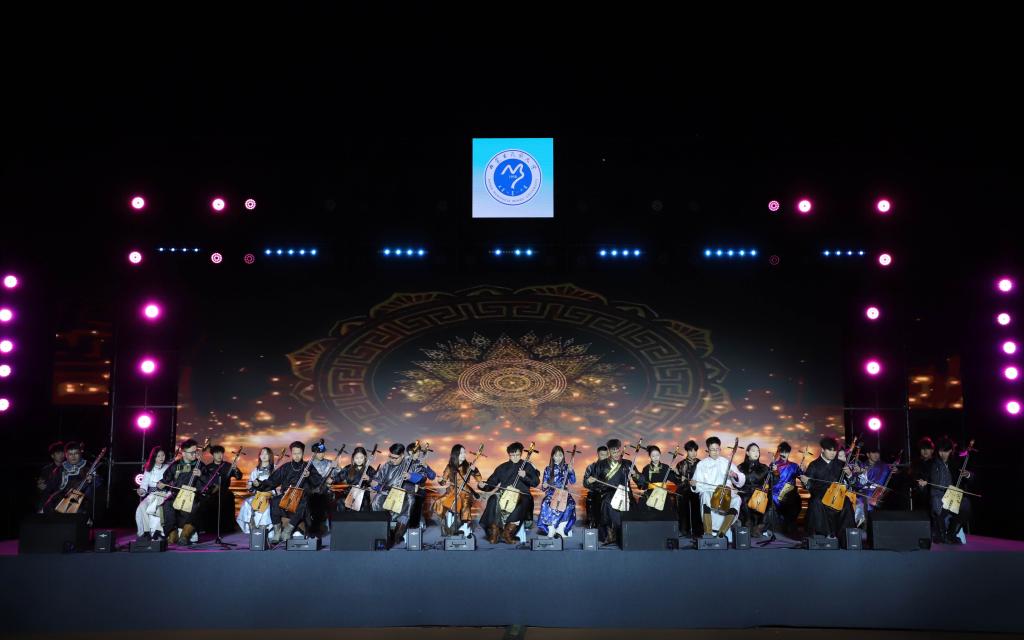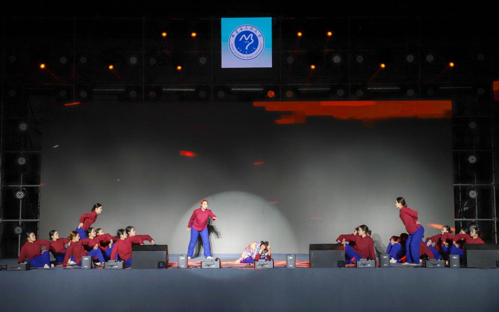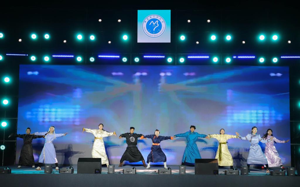 整场晚会精彩纷呈,马头琴合奏《万马奔腾》展现了草原文化的独特魅力;“石榴籽杯”舞蹈大赛中的顶碗舞《吉祥》《倒喇》等优秀作品,以优美的舞姿诠释了各民族文化的交融互鉴;由大学生主持团及国旗护卫队带来的舞台剧《风雨兼程》,深情回顾了党的百年奋斗历程,激发了师生的爱国热情。晚会现场还分享了我校学子在蒙超联赛中取得的优异成绩,12名民大学子助力通辽队成功挺进决赛,展现了我校学子不仅在学业上追求卓越,在体育赛场同样奋勇争先的精神风貌。