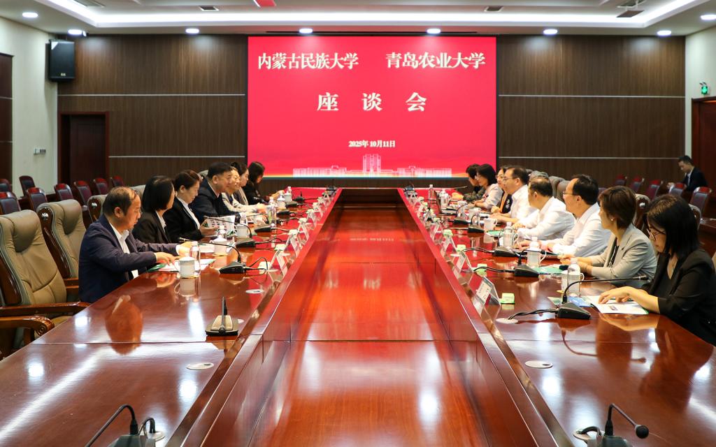 赵金山代表学校对赵东海一行的到来表示热烈欢迎,感谢内蒙古民族大学长期以来对青岛农业大学的支持。他表示,两校都设有作物学、草学、畜牧学等涉农学科,双方具备交流合作的坚实基础,希望双方进一步加强交流协作,推动两校资源共享与优势互补,共同为服务农业强国建设贡献积极力量。