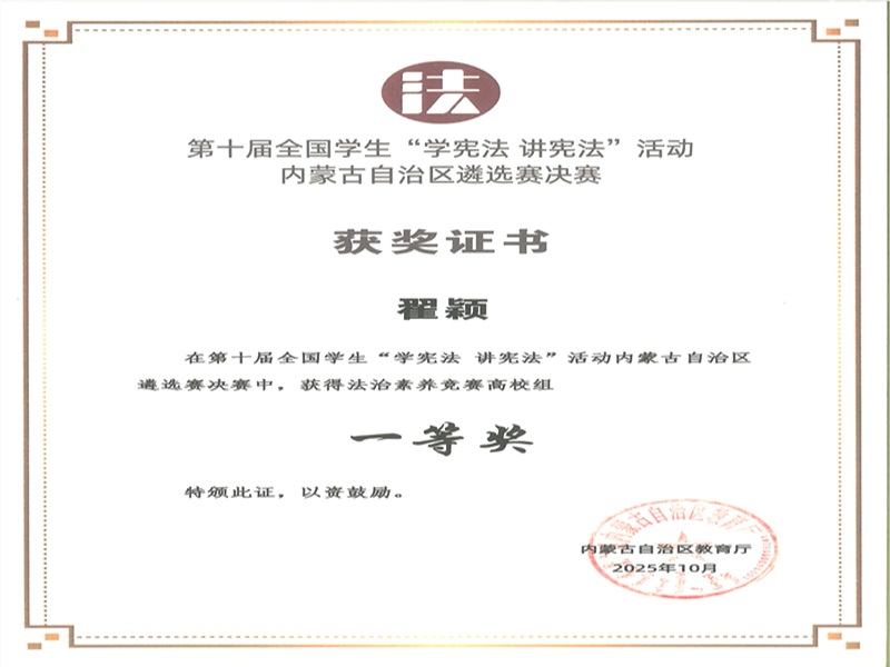 全区学生“学宪法 讲宪法”自治区遴选赛分为线上复赛和线下决赛两个阶段进行。线上复赛环节,翟颖同学以总分第二名的成绩晋级决赛;决赛中,翟颖同学凭借扎实的法治素养与出色的临场表现,在全区高校优秀选手中脱颖而出,夺得高校组第一名,将代表内蒙古自治区参加全国总决赛。