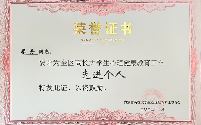 10月23日,内蒙古自治区高等教育学会大学生心理教育专业委员会2025年年会在内蒙古科技大学召开。我校获得全区高校大学生心理健康教育工作“先进集体”荣誉称号,大学生心理健康教育中心主任李丹获得全区高校大学生心理健康教育工作“先进个人”荣誉称号。