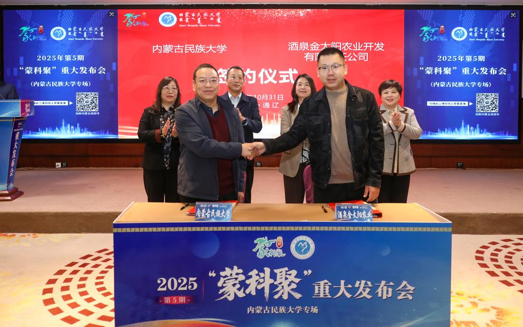 会上,内蒙古民族大学和酒泉金太阳农业开发有限责任公司签订了《玉米新品种〈内民玉甜糯105〉实施转让协议》。学校发布了“鲜食玉米新品种”“蒙古牛‘相牛1号’育种芯片”“血液布鲁菌DNA提取试剂盒”“使用CYP1A转基因斑马鱼评估持久性污染物”“多功能乒乓球训练球台”5项成果。