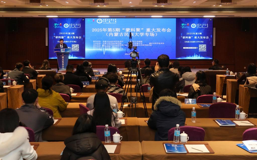 10月31日上午,2025年第5期“蒙科聚”重大发布会(内蒙古民族大学专场)在通辽市鑫达国际酒店举行。通辽市人民政府副市长杨焕枝,内蒙古民族大学党委委员、副校长杨恒山,通辽市科学技术局局长塔娜及相关科室、下属单位负责人,通辽市部分科技企业负责人,学校相关学院负责人、教师代表,科学技术处全体人员参加发布会。科学技术处副处长张青山主持发布会。