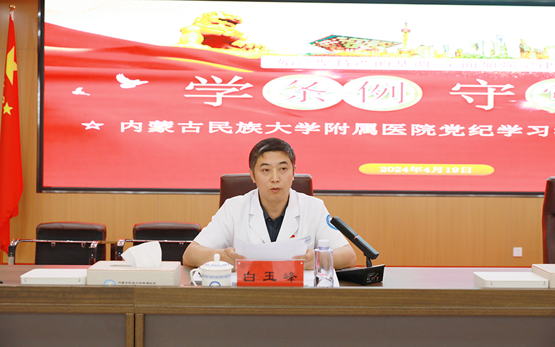 会上,附属医院(临床医学院)党委委员、纪委书记白玉峰传达学习了习近平总书记关于党纪学习教育的重要讲话和重要指示精神,中共中央办公厅《关于在全党开展党纪学习教育的通知》,中央、自治区党委党的建设工作领导小组会议精神以及学校党委《关于在全校开展党纪学习教育的工作方案》。