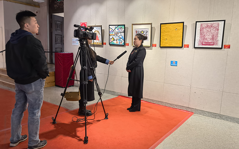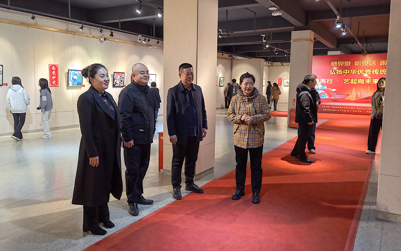 3月29日上午,通辽市科尔沁区第二中学校长王颖伦、内蒙古民族大学幼儿园园长韩春玲一行来到美术学院参观“感党恩、听党话、跟党走”“向美而行·艺起向未来”美育作品联展。学院党委书记张琪、院长王永波、副书记杨文军陪同参观。科尔沁区电视台对本次展览进行跟踪报道。