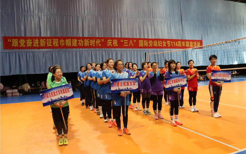 阳春三月,草木蔓发。为欢庆第114个“三八”国际劳动妇女节,丰富教职工文化生活,深度推进校地合作,增强凝聚力和向心力,3月9日上午,校工会在通辽市公安局交通管理支队排球馆举办了“跟党奋进新征程 巾帼建功新时代”校地联谊排球赛。学校工会负责人刘巴图,附属医院党委书记康曙光,通辽市融媒体中心党委书记、主任吴忠利,通辽市公安局交管支队党委委员、副支队长金布林、沈朝辉、王秀琴出席比赛,为各自派出的四支代表队队员加油助威。