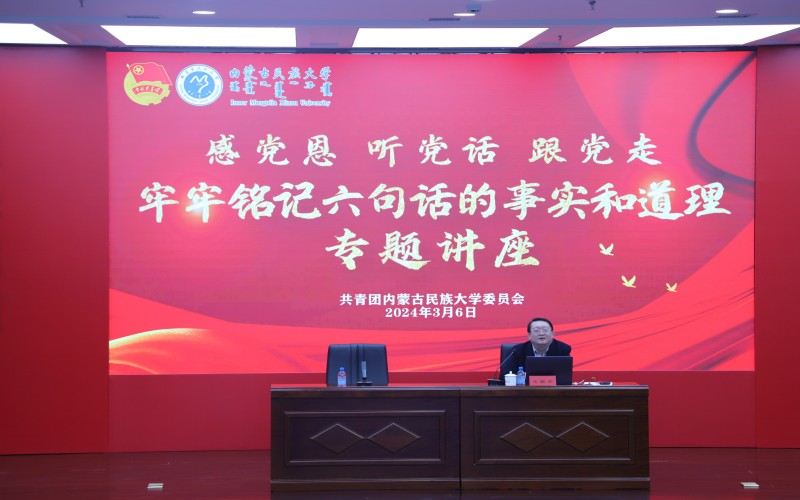 为全面贯彻落实习近平总书记对内蒙古的重要指示精神,引导广大师生深刻理解“六句话”的事实和道理,3月6日晚,校团委在图书馆大报告厅开展“牢牢铭记六句话的事实和道理”专题讲座。讲座由校团委书记王振宇主讲,校团委工作人员、各学院团总支书记、校院两级学生会干部、青马班学员聆听讲座。