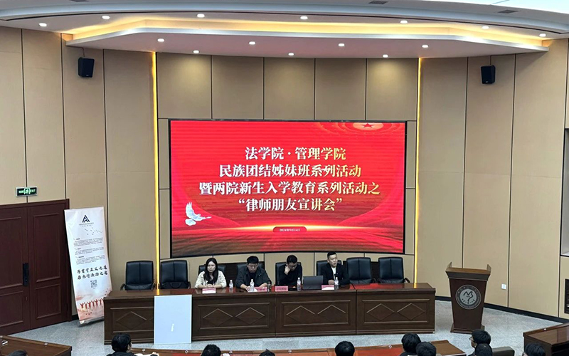 为丰富民族团结进步月活动内容,加强民族团结姊妹班共建,增强新生法律意识,明确自身权利义务,更好适应校园生活,营造安全、和谐、法治的校园环境。9月24日晚上,法学院与管理学院联合内蒙古昂若律师事务所开展民族团结姊妹班系列活动暨两院新生入学教育系列活动之“律师朋友宣讲会”,法学院学工办主任王振宇、内蒙古昂若律师事务所律师斯日古楞、王啸宇、徐丽丽以及两院180名同学参加本次活动。