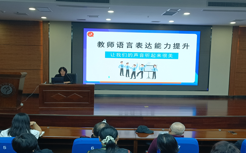 在普通话培训环节,我校省级水平测试员普通话培训专家、历史与旅游文化学院贾淑荣教授作了题为《教师语言表达能力的提升——让你的声音听起来很美》专题讲座。她从教师语言概述与教师语言的艺术两方面进行了介绍,系统阐述了教师语言的概念、重要性以及特征。为了让教师们对教师语言的重要性有更直观的感受,贾教授在现场对被培训教师进行了音质训练,教师们积极参与,意识到了语言表达能力的重要性,为我校国家通用语言文字的普及和推广奠定了基础。