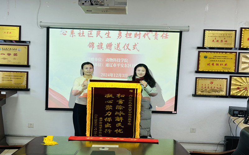 12月3日,通辽市平安东区社区副主任赵红、平安东区社区副书记牛艳辉于西拉木伦校区树人楼314会议室赠予动物科技学院“扫雪除冰解民忧,凝心聚力保出行”锦旗。学院党委书记包兰英、学工办主任鲍海英、团总支书记董文净、辅导员邢家辉、藏小文参加活动。