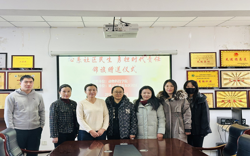 通辽市平安东区社区对学院志愿服务工作表示支持与肯定,赵红向包兰英递交锦旗,并表示,作为动物科技学院“大学生社区实践计划”的对接单位,自2023年10月起学院学生持续开展了社区环境清洁、扫雪除冰、宠物养护宣讲等一系列志愿服务活动。这次赠送锦旗,不仅是对动物科技学院长期以来给予社区支持和帮助的感谢,更希望借此机会强化工作协同,加强校地合作,共同为构建和谐美好的生活环境贡献力量。