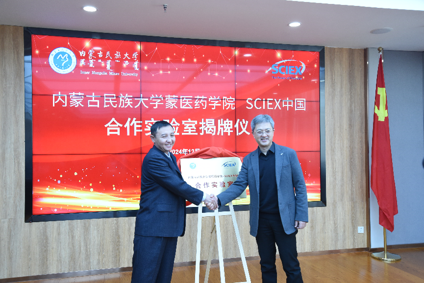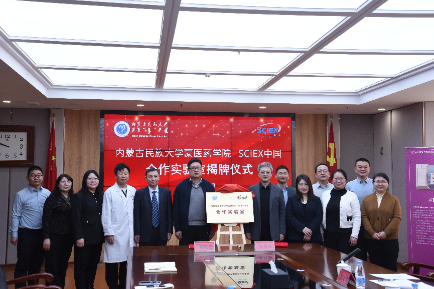 12月12日,蒙医药学院与SCIEX中国举行合作实验室揭牌仪式。SCIEX中国现场服务总监黄舜斌、高级应用经理刘冰洁、售前支持经理郭丽萍、售前应用经理李春波、生命科学研究市场开发经理方晶晶、应用专家满卓、中国西北地区销售主管马健、内蒙古区域客户经理姜瑞清,蒙医药学院领导班子和多位科研骨干教师参加活动。