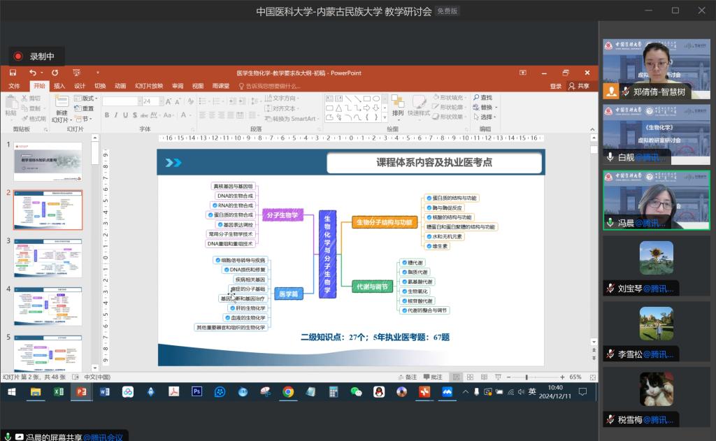 研讨会上,基础医学院生物化学与分子生物学教研室主任白靓分享了本学期同步课堂实施过程中的切身体会与收获,并对虚拟教研室平台建设提出建议。中国医科大学生物化学与分子生物学教研室冯晨老师介绍了一流课程的持续建设进展及双方虚拟教研室平台建设规划。在教学分享环节,中国医科大学刘宝琴老师详细分享了课程设计思路与教学方法创新,为参会教师提供了宝贵的实践经验。