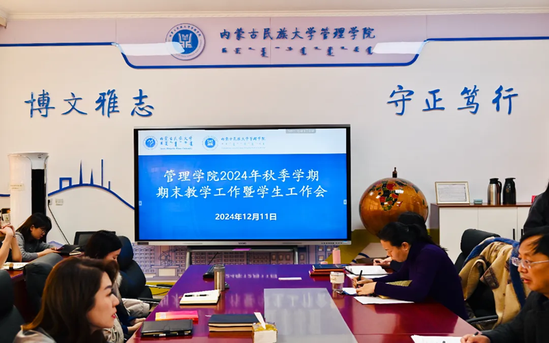 陈文茹传达了《内蒙古民族大学2024年秋季学期期中教学检查总结》《关于开展2024年秋季学期期末教学检查的通知》《2024年春季学期期末考试总结》《2024年秋季学期期末考试安排》等文件精神,并结合学院实际,对学院期末教学、考试等工作进行了详细部署。