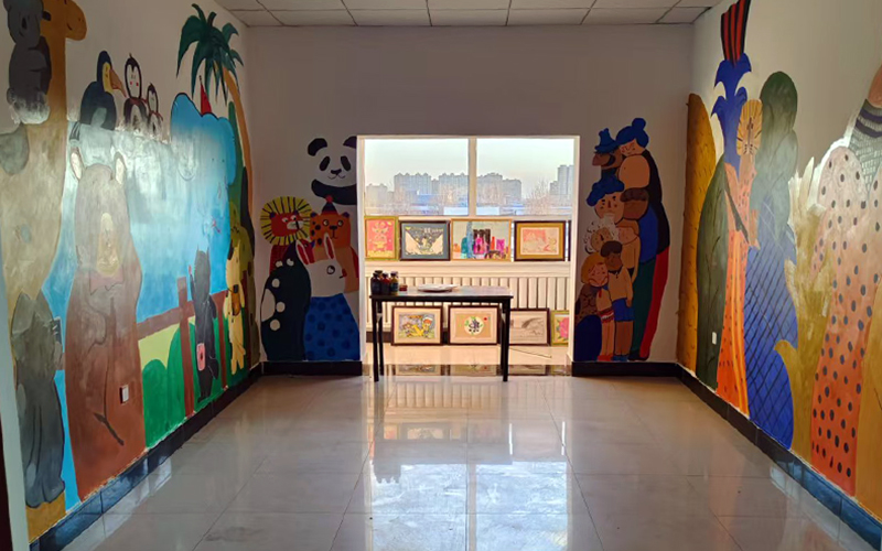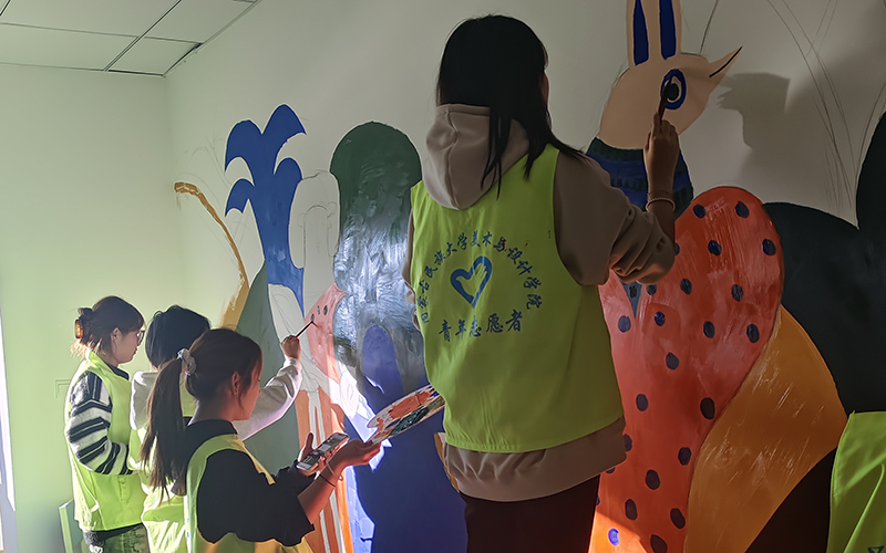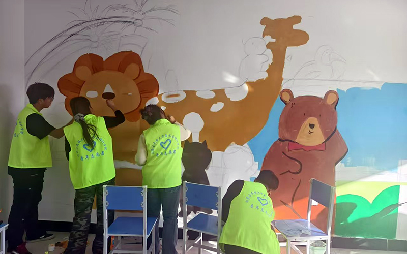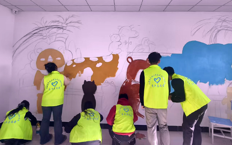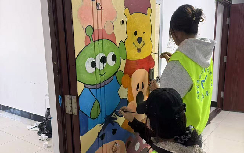 活动期间,20余名志愿者精心构思,全神贯注地挥动画笔,勾勒出色彩斑斓的线条,在墙面上创造出一个个生动有趣的童话世界。图画色彩明艳、创意满满,承载着对孩子们的鼓励与祝福。