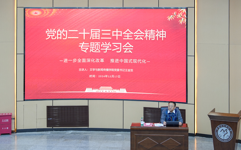 12月17日中午,文学与新闻传播学院党委书记王金双教授在明理楼报告厅为学院全体学生党员、入党积极分子讲授党的二十届三中全会精神专题党课。会议由学院教师党员邱胜男主持,共150余人参加。