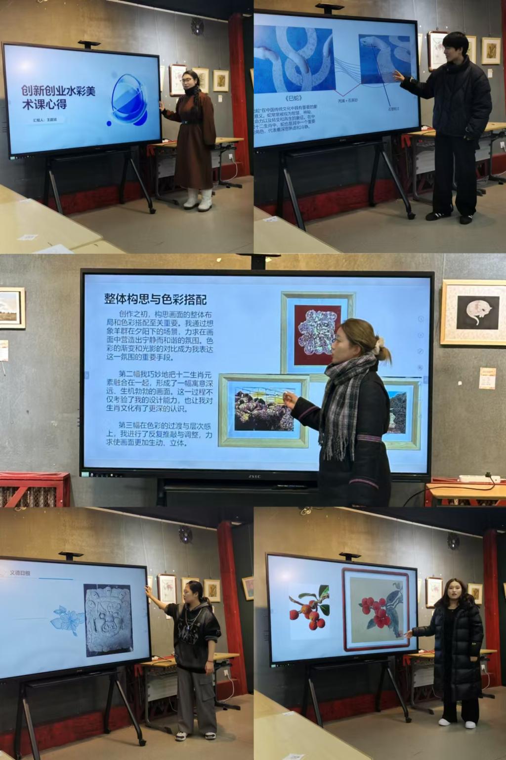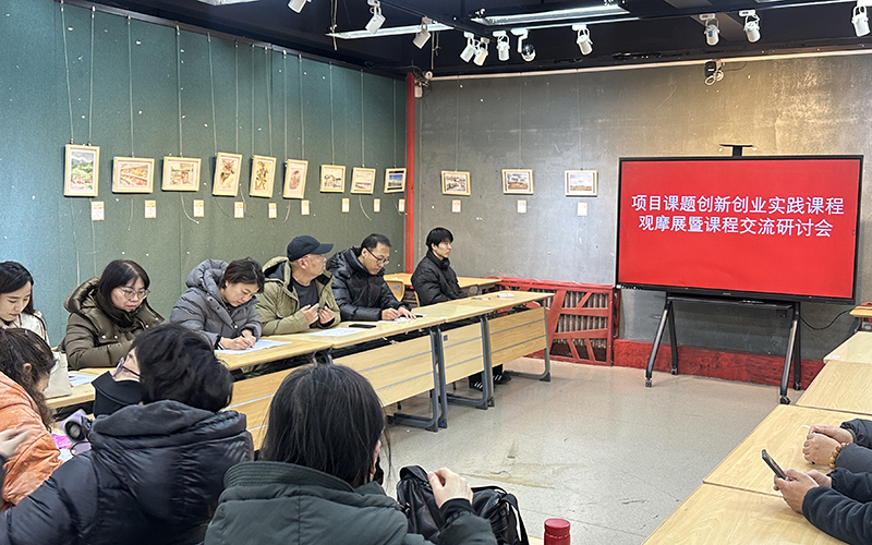 12月23日,美术与设计学院美术系专业方向教研室主办的《项目课题创新创业实践》课程观摩展暨课程交流研讨会在逸夫楼二楼展厅顺利举行。美术系主任张宁、专业方向教研室主任满达、副主任邹畅、公共美育教研室主任格根萨仁、副主任崔子庆、基础教研室副主任赵彬等十余位教师参加活动。