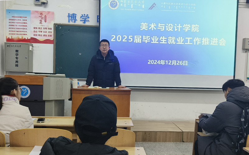 12月26日下午,美术与设计学院在逸夫楼328多媒体教室召开2025届毕业生就业工作推进会。学院党委副书记杨文军、学工办主任吴潮洛蒙及2025届全体毕业生参加会议。会议由吴潮洛蒙主持。