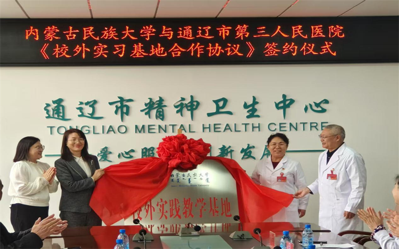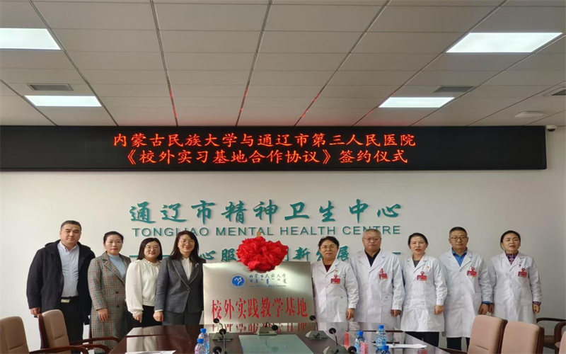 3月4日,内蒙古民族大学护理学院与通辽市第三人民医院(通辽市精神卫生中心)正式签署校外实践教学基地协议,并举行揭牌仪式。内蒙古民族大学护理学院院长董丽霞、教务处副处长洪艳一行,通辽市第三人民医院党总支书记雷桂芳、院长孙洪军等院领导班子成员出席会议。学院副院长于红梅主持签约揭牌仪式。