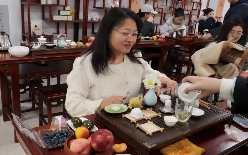 随后,崔宁以流畅而精湛的手法,为在场的老师们呈现了一场精彩的花式茶艺表演。她不仅展示了盖碗茶的冲泡技巧,还分享了日常生活中的茶文化,引领大家一同感受茶道的独特韵味。同时,她还详细介绍了各类茶叶的特色、历史背景及冲泡的关键步骤,充分展现了茶文化的深厚底蕴与广博内涵。