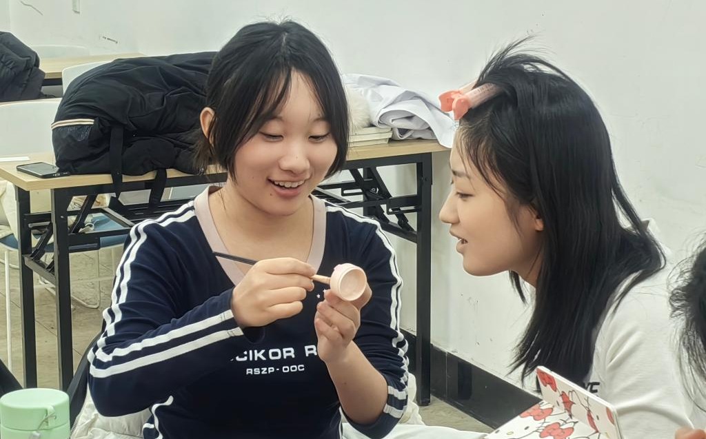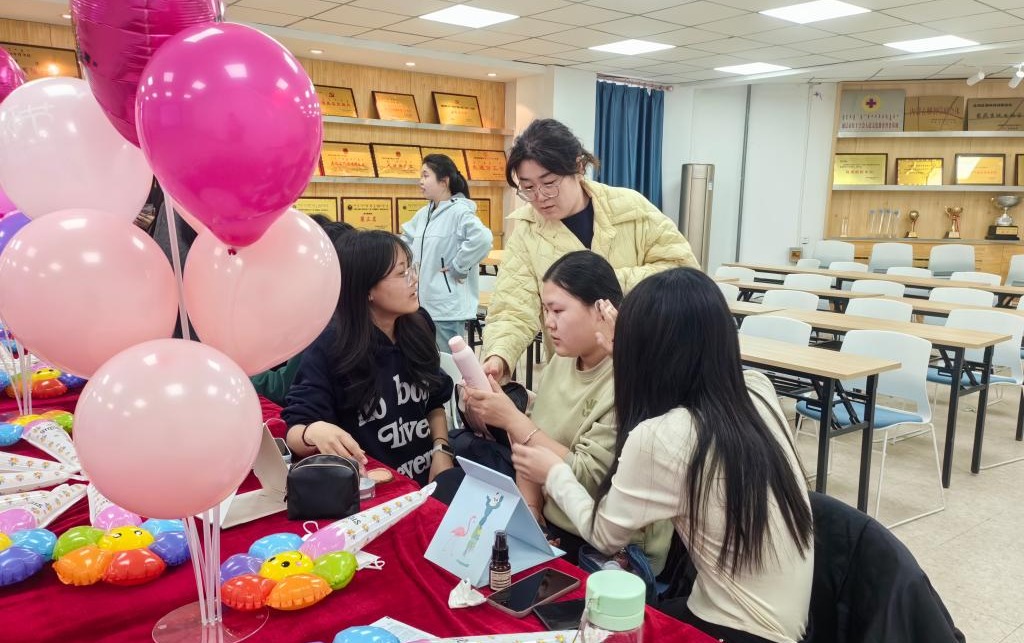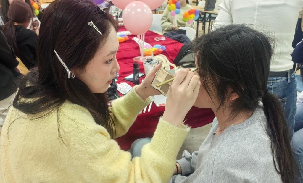 活动现场充满着温馨浪漫气息。同学们带着“美妆百宝箱”,从妆前补水、面部打底到五官勾勒,大家在互相交流中,完成妆容打造。“美妆达人”为“新手小白”耐心讲解化妆手法和技巧,彼此之间互相分享私藏的宝藏单品,交流化妆经验,现场气氛活跃。