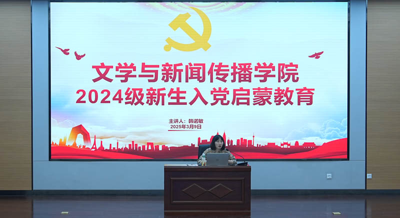 为进一步加强青年大学生的理想信念教育,提升全体2024级新生对党的认识,端正入党动机,熟悉入党流程,号召同学们积极向党组织靠拢,3月9日晚,文学与新闻传播学院在图书馆大报告厅开展2024级新生入党启蒙教育,团总支书记韩诺敏担任主讲,共260余名2024级学生参加。