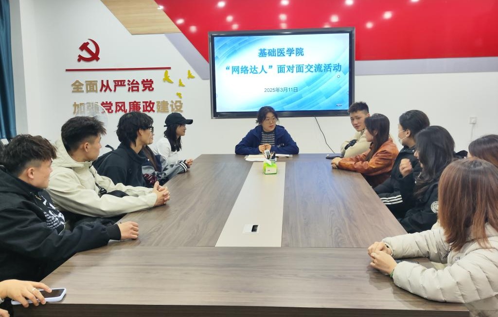 3月11日晚,基础医学院在医学楼403会议室举行“网络达人”面对面交流活动。学院团总支副书记王琦、各班级“网络达人”参加座谈交流。活动由王琦主持。
