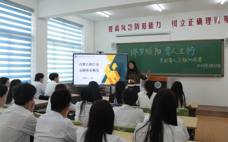 启动仪式结束后,与会人员一起参观了金融活动室。随后,金融教育示范基地主任于滢老师以《内蒙古银行业金融体系概览》为题,为资助育人金融训练营的同学们进行了授课。
