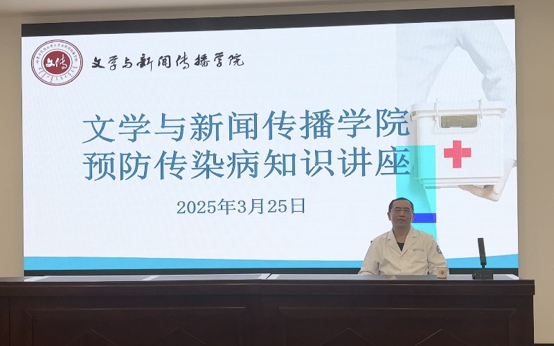 3月25日,文学与新闻传播学院在图书馆内蒙古诗歌研究中心举办“预防传染病知识讲座”,邀请内蒙古民族大学附属医院门诊部主任李贵山担任主讲。学院学工办主任兰英、综合办公室副主任张红艳、辅导员孙佳欣及90余名学生到场聆听。学院党委副书记包宝柱主持讲座。