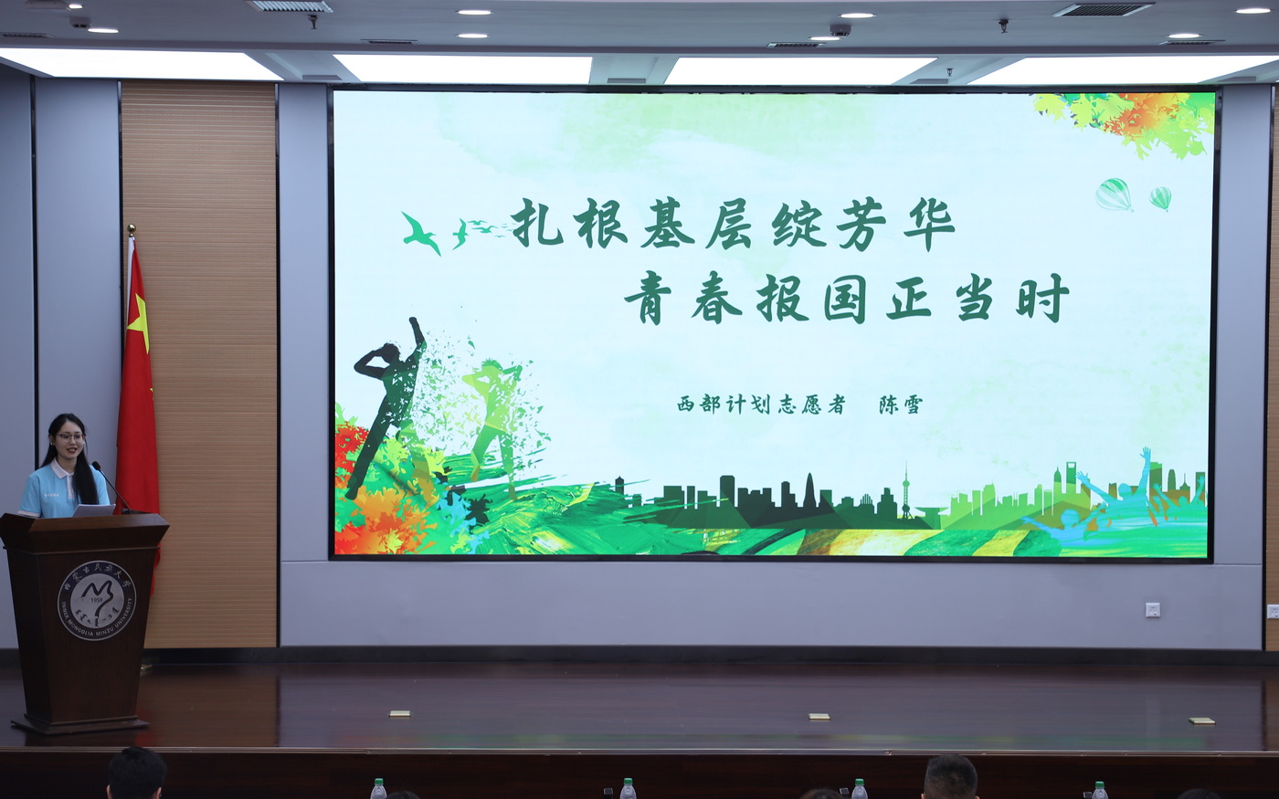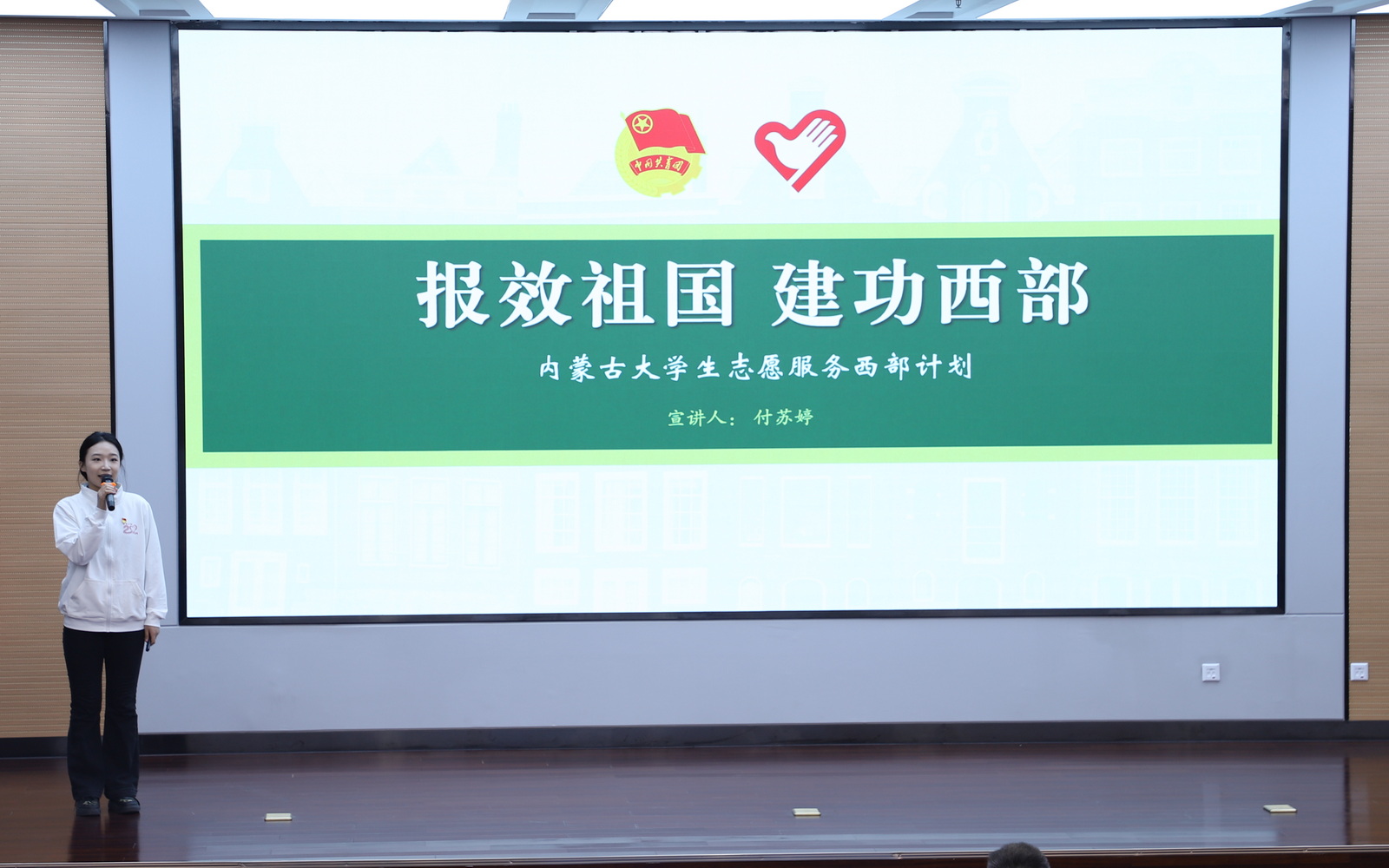 宣讲会上,三位优秀志愿者代表以亲身经历讲述奋斗故事:退役女兵常笑楠褪下戎装不改本色,扎根社区基层用脚步丈量民生;大学生陈雪以书香作舟楫,在基层图书馆架起知识传播的桥梁;浙江青年应辰申跨越2000公里奔赴内蒙古,用宣讲足迹绘就青春坐标。他们用不同方式诠释着"奉献、友爱、互助、进步"的志愿者精神,展现了新时代青年的责任担当。内蒙古自治区西部计划宣讲团成员付苏婷系统解读了2025年西部计划政策,详细说明报名流程、服务方向及保障措施。
