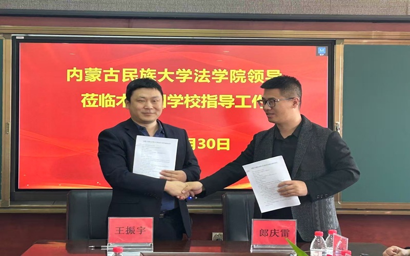 法学院学工办副主任王振宇与木里图学校法治副校长朗庆雷共同签署了《内蒙民族大学法学院青少年普法阳光驿站服务协议》,清河向木里图学校授牌。