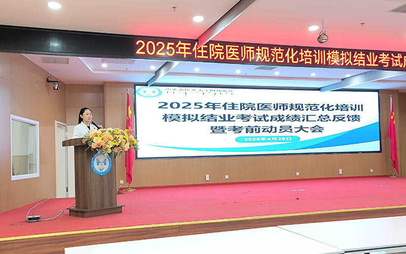 为全面总结住院医师规范化培训模拟结业考试情况,进一步提升培训质量,确保学员顺利通过结业考核,4月29日,内蒙古民族大学附属医院毕业后教育办公室在门急诊医技综合楼448报告厅组织召开2025年住院医师规范化培训模拟结业考试成绩汇总反馈暨考前动员大会。附属医院党委委员、副院长张东威,党委委员、副院长王墨飞,各专业基地负责人、教学秘书及2025年参加结业考试的全体住培学员参加会议。