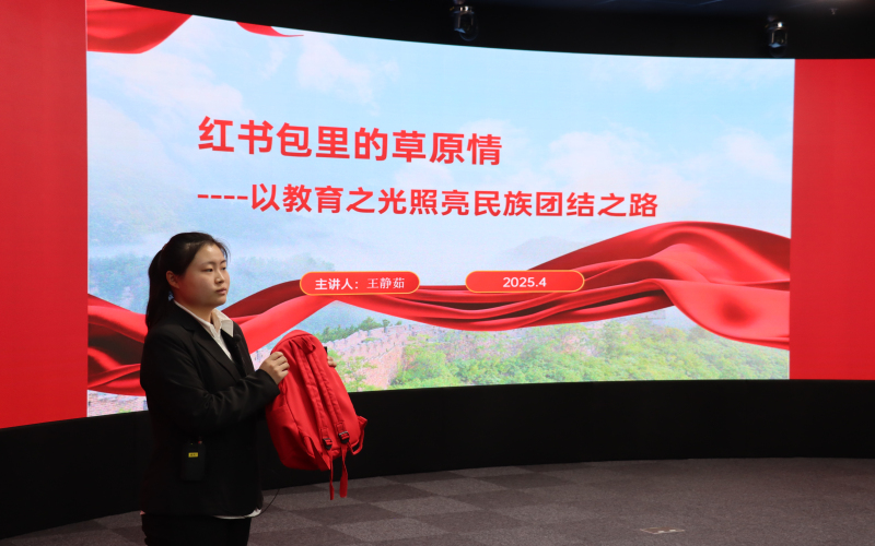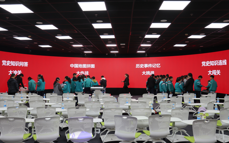 本次活动以科技与历史交融的沉浸式体验拉开序幕。在沙盘屋,师生们分组参观数字资源中的红色场馆,身临其境感悟历史场景,认真观看数字人生动讲述党的百年征程。随后,2025年上半年新发展团员面向团旗庄严宣誓,以青春誓言传递责任担当。学院共青团一院一品项目“青春坐标”数智化思政育人工作坊两名成员宣讲了“三千孤儿入内蒙”、“红书包里的草原情”等民族团结小故事。思政集章游戏将研学活动推向高潮,学生们通过团队协作完成红色知识问答、国家地图拼图、历史事件记忆挑战等环节,争相集章兑换纪念品,现场洋溢着求知热情与欢声笑语。活动尾声,学院志愿者带领师生们参观知行楼教室,在静谧的学习环境中感受大学文化气息,在滨河校区食堂一楼体验校园生活,为研学之旅画上温馨句号。