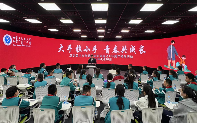 为纪念五四运动106周年,弘扬爱国、进步、民主、科学的五四精神,引导青少年在实践中厚植家国情怀,树立远大理想。4月30日上午,通辽市科尔沁左翼中旗实验小学的39名师生来到内蒙古民族大学马克思主义学院虚拟仿真中心参加“大手拉小手 青春共成长”纪念五四运动106周年特别活动,以数智化沉浸式方式共同感受大学校园文化氛围,在协作交流中凝聚青春力量。学院党委副书记山丹、团总支书记德力根胡参加了本次活动。