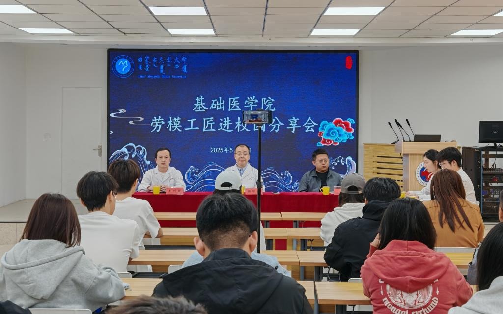 为进一步弘扬劳模工匠精神,发挥优秀榜样示范带动作用,5月18日晚,基础医学院“做客直播间”在医学楼501会议室开播。本期活动以“励能笃行,匠心致远”劳模工匠进校园分享会的形式开展,特邀“内蒙古自治区先进工作者”、我院免疫学教研室翟景波教授以及优秀校友代表王兴亚、王帅担任活动嘉宾。各班级40余名学生代表现场参与活动,另有550余名学生线上观看活动直播。分享会由李洋溢、张宇璇同学主持。