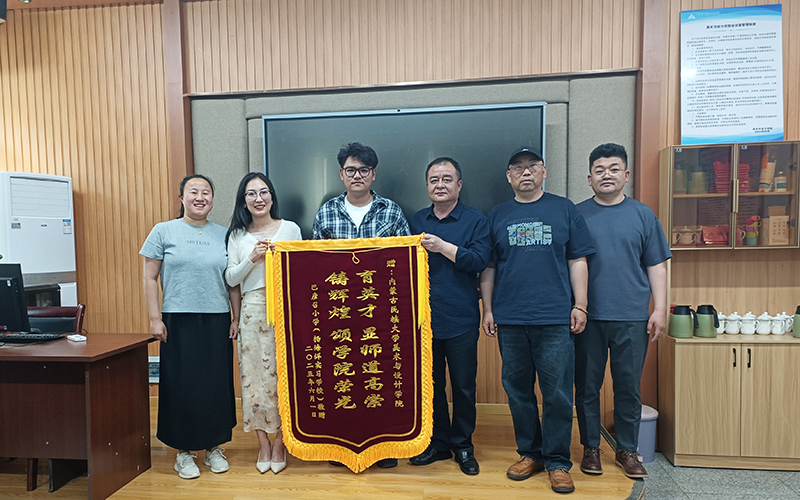 育英才显师道高崇,铸辉煌颂学院荣光,6月9日,美术与设计学院迎来了一份特殊的礼物——科左中旗希伯花镇巴彦召小学教师代表亲赴学院赠送锦旗,对美术学专业实习学生杨海洋同学在支教实习中的卓越表现表示感谢以及表达对学院人才培养质量的高度认可。