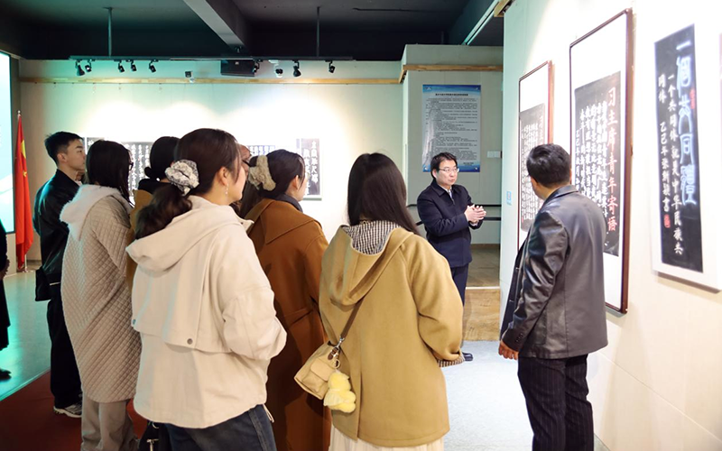 10月16日,美术与设计学院邀请学校人事处处长唐春玉教授深入美术展览馆为学科教学(美术)专业研究生进行板书展评教学活动,围绕学科教学(美术)专业研究生板书、书写规范字等方面的创新与实践,粉笔字基础笔画结构练习,板书书写布局练习,主次笔画练习,篆书、草书作品课程教学等情况进行交流。