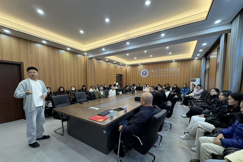 研讨围绕“舞蹈作品编创与科研融合路径”“舞蹈学专业就业与发展规划”两大议题展开。满都呼老师结合二十余年舞蹈表演与编创经验,指出应以科研构建“文化基因库”,以编创推动成果转化,依托“产学研用”机制保障专业发展。在就业指导上,他针对学生就业困惑,提出多维就业方向、能力构建体系与分阶段规划,为学生指明成长路径。研讨中,满都呼老师理论阐释深入,亲自示范动作,与同学亲切互动,现场气氛热烈。