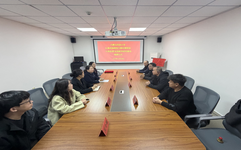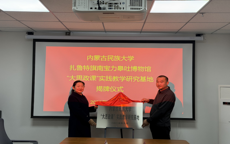 为深入贯彻习近平总书记关于思政课建设的重要论述,落实“大思政课”重要指示精神,充分挖掘社会资源在思政教育中的积极作用,10月28日,内蒙古民族大学与通辽市扎鲁特旗南宝力皋吐博物馆成功举行了“大思政课”实践教学研究基地签约揭牌仪式。扎鲁特旗文化和旅游局局长陈井明、南宝力皋吐博物馆馆长刘志强和部分馆员,马克思主义学院党委副书记山丹、副院长舒心心、中华民族共同体概论教研室主任代宏丽及学院部分教师共同参加了本次活动。