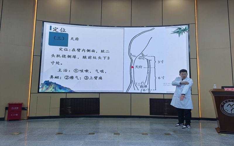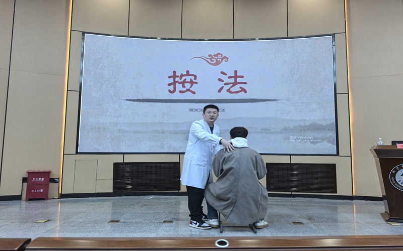 讲座中,王策围绕大学生日常健康需求,从推拿的核心概念切入,系统讲解了推拿“便捷、安全、高效”的特点及疏通经络、缓解疲劳等作用。他结合人体经络基础知识,通过理论讲解与动作示范相结合的方式,重点演示了针对颈肩腰腿痛的常用推拿手法,并详细强调了推拿前的身体评估、手法力度控制等注意事项,帮助学生快速掌握实用技能。