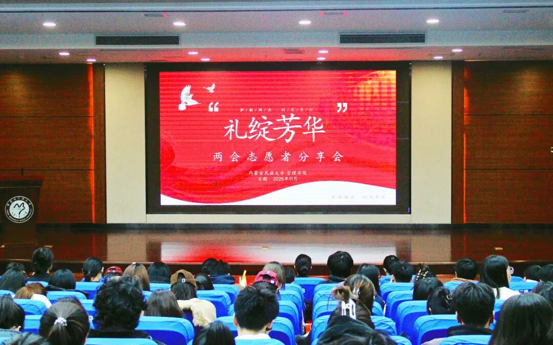 为深入学习贯彻全国两会精神,将国家发展蓝图与青年成长紧密融合,11月1日,管理学院在图书馆小报告厅举办“礼绽芳华”两会志愿者分享会。作为内蒙古民族大学2025年校园文化建设“一院一品”重点项目——“亮丽北疆·以礼润心,以仪促行”系列活动之一,本次活动以榜样为引领,深化实践育人,激励广大学子将个人理想融入国家发展的宏伟征程。