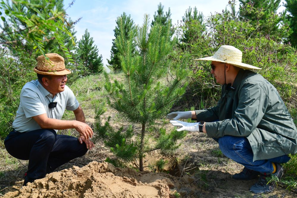 “科尔沁沙地有大风、干旱、缺水等特点,我们为了让种下的树都能成活,反复试验总结,研究出一种新的造林方法。”在科左后旗科尔沁沙地歼灭战项目区,旗林业工作站站长朝克吐一边操作,一边为布雷德详细介绍“深栽浅埋”造林法:“根据苗木的高度在沙地里挖一个60-100厘米的坑,把树苗放进去后,需要回填土,现在我考考你:咱们是填挖出来的土,还是填坑周围的地表土?”
