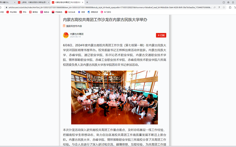 6月6日,2024年度内蒙古高校共青团工作沙龙(第七组第一期)在内蒙古民族大学滨河园区明理书屋举办。校党委副书记王烨辉出席活动并致辞。内蒙古民族大学、赤峰学院、通辽职业学院、科尔沁艺术职业学院、内蒙古交通职业技术学院、锡林郭勒职业学院、赤峰工业职业技术学院、赤峰应用技术职业学院八所高校团委负责人及内蒙古民族大学各学院团总支书记参加活动。